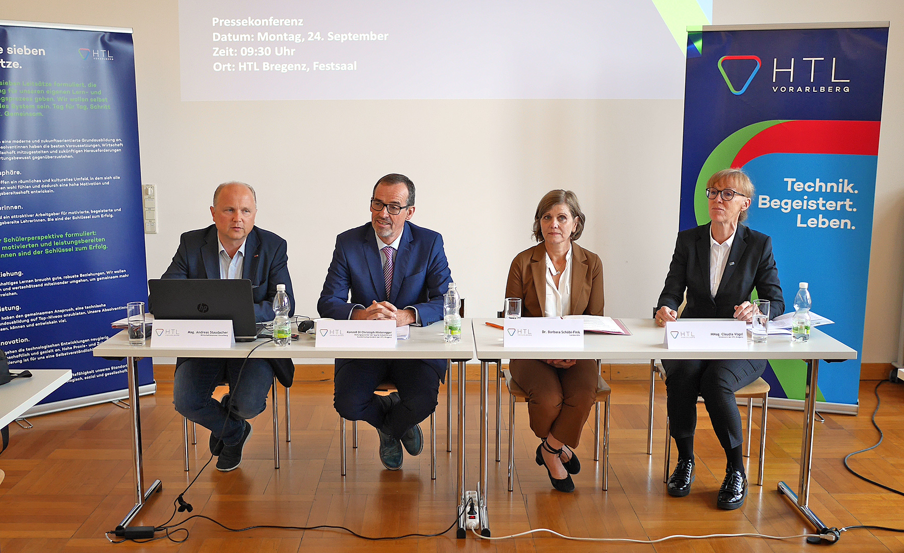 Bild PK_HTL Vorarlberg_1:Pressekonferenz zum HTL-Strategieprozess v.l.: Mag. Andreas Staudacher (Sparte Industrie); DI Christoph Hinteregger, Bildungssprecher der Vorarlberger Industrie und Kuratoriumspräsident der HTL Bregenz; Landesrätin Dr. Barbara Schöbi-Fink und MMag. Claudia Vögel, Direktorin der HTL Bregenz
