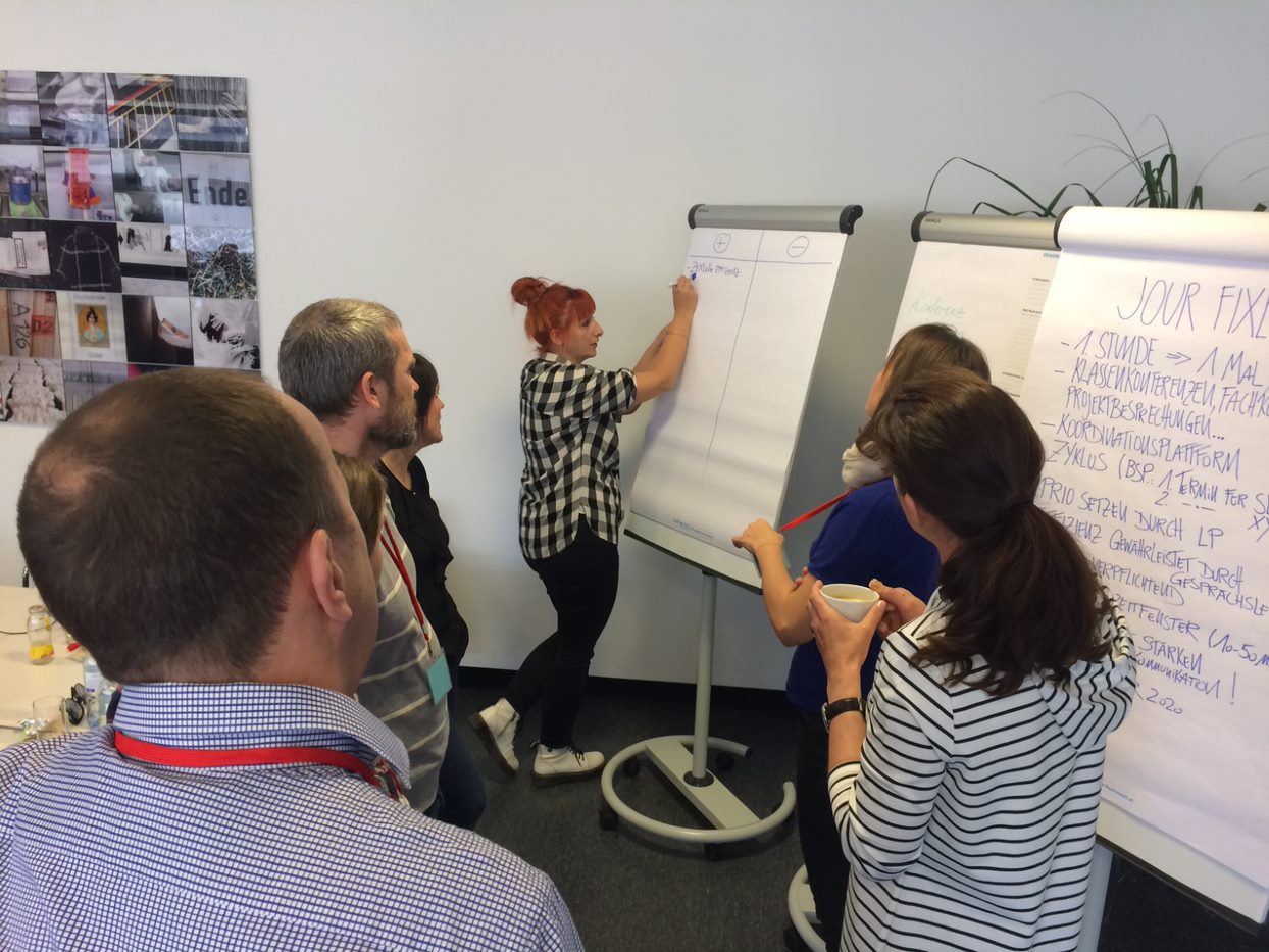 Alle Lehrerinnen und Lehrer waren im darauffolgenden von Kollegen Markus Kornfehl moderierten Teil der Konferenz eingeladen, an verschiedenen Schulqualitätsthemen mitzuarbeiten. Die Handlungsfelder von Seiten des Schulqualitätsmanagements umfassten das pädagogische Konzept, den Lebensraum Schule, die Infrastruktur und Kommunikation. Alle Anwesenden konnten sich in Form der innovativen und kreativen „Open Space“-Methode je nach Interesse in den Prozess mit einbringen. Insgesamt wurde in sieben Arbeitsgruppen 27 konkrete Maßnahmen zu einzelnen Unterthemen erarbeitet, die nun in weiterer Folge abgearbeitet werden.